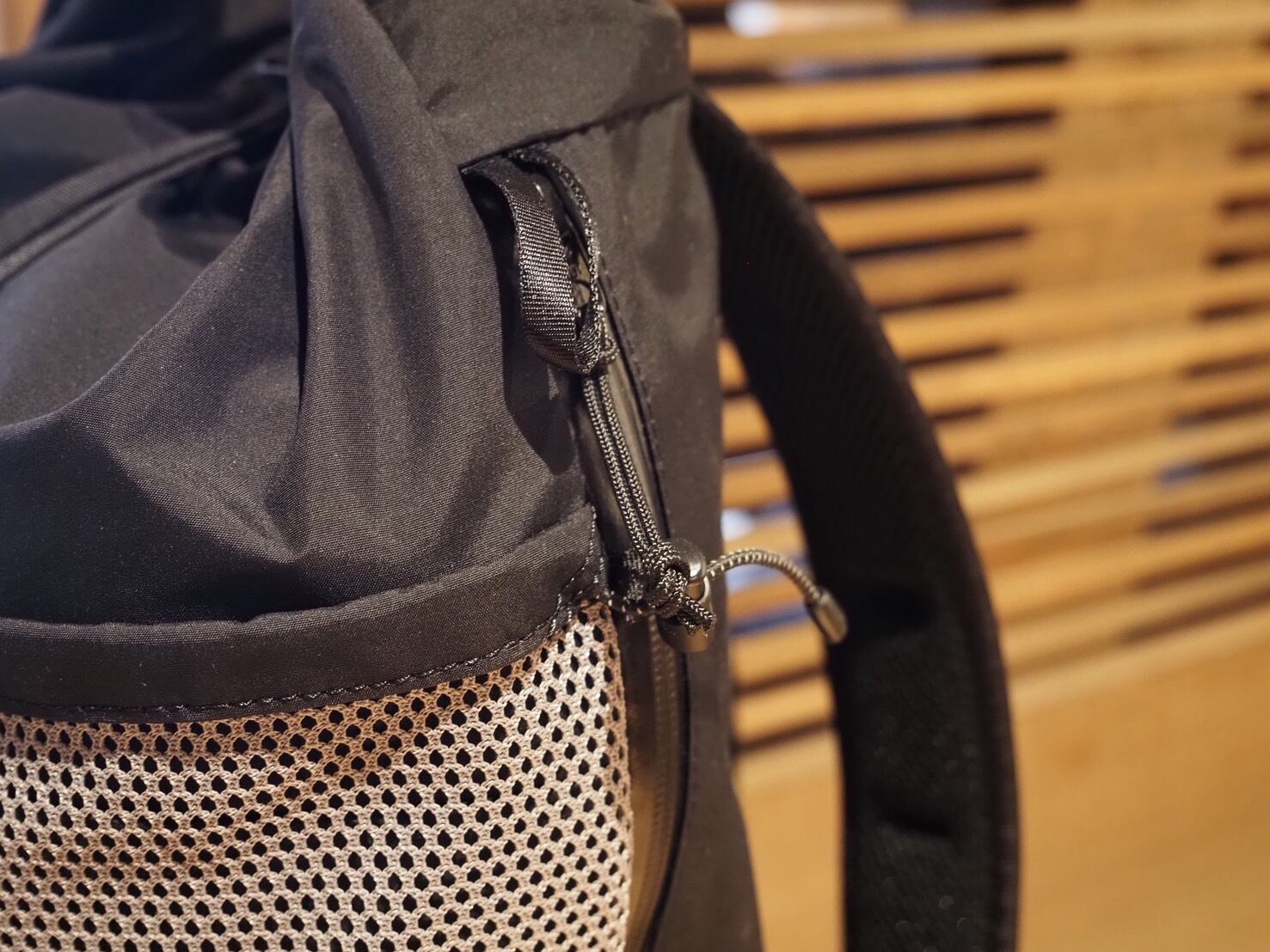ロールトップ以外にも、本体サイドにファスナーがあり、そこからも荷物の出し入れができます。