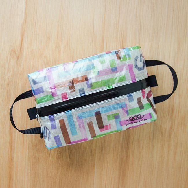カラフルな幾何学模様のポーチ。実はこちら迷路なんです。「見てカワイイ、触って楽しい、使って安心」なギアが作れないかなと色んな迷路を描いてみました。しっかりと楽しめるくらい難しく作ったので、このポーチを中心にワイワイしてくれたらと思っています。Play in the mazel!!