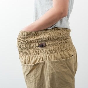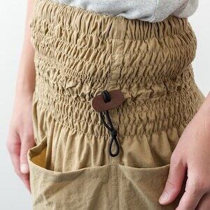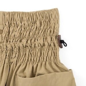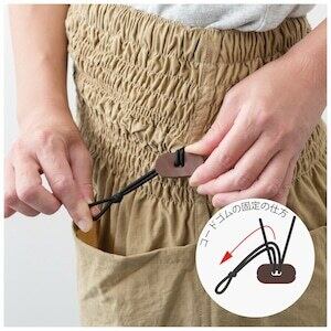 ウエストの細い方や、モンペズボンの大きなポケットに重量のある荷物を入れるような場合はコードゴムを引き締めることでズボンのずり下がりを防ぎます。