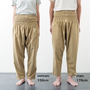主に女性の野良着とされていたもんぺは大変動きやすく機能的で、造りにも無駄がありません。そのもんぺの良いところをそのままに、様々な体型にフィットするように私たちなりに見直したのが「モンペズボン」です。