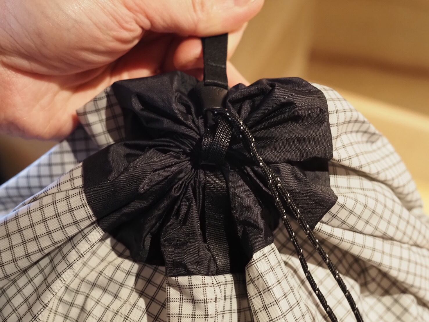 ショルダーのストレッチメッシュのポケットは、コードを締め上げることでボトルが抜け落ちることを防ぐ。