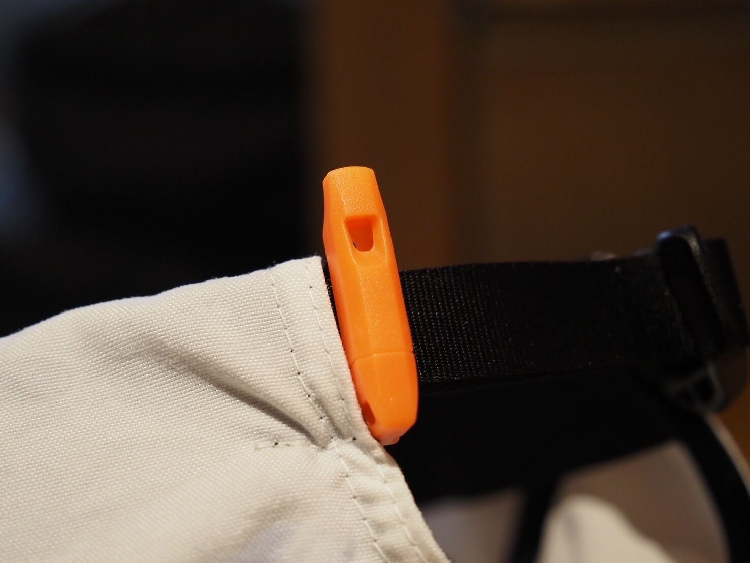 背面にはテープのバタつきや、抜け出て来るのをおさえるホイッスル付きストラップキーぱが付属しています。山で熊の痕跡を見つけた時は、角笛を吹く牛飼いの様に、このエマージェンシーホイッスルを吹いて警戒にあたるのも良いかも知れません。